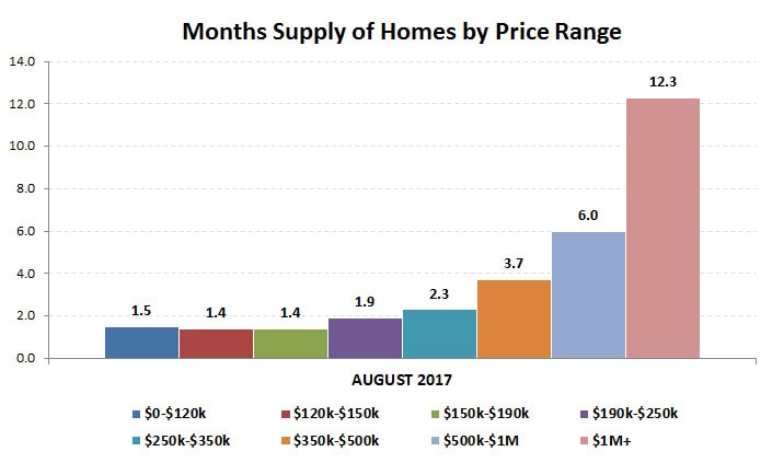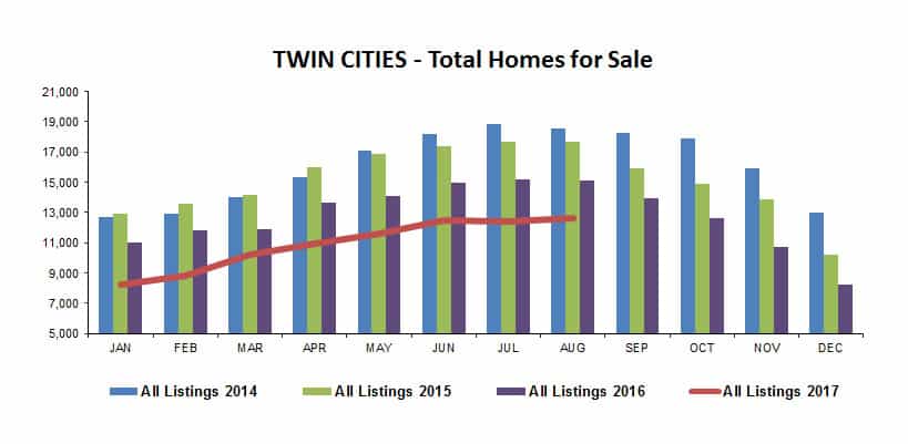The total number of homes for sale in the Twin Cities real estate market continues to hang below previous years, with August 2017 falling 16.7% below August 2016.