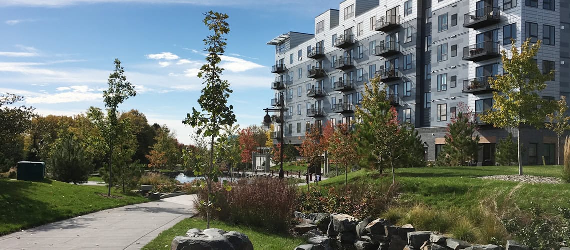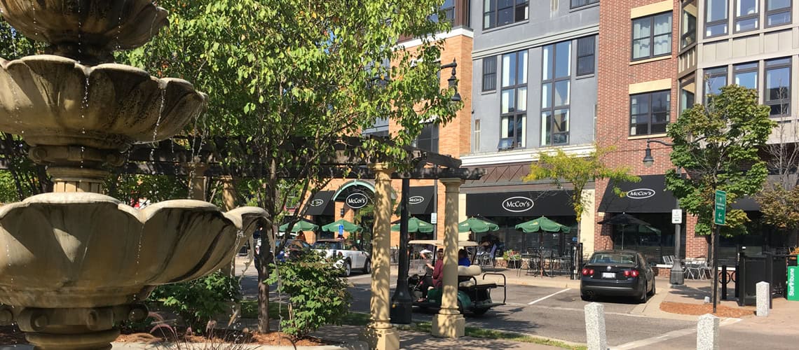 Excelsior & Grand in St. Louis Park was an early urban village, built in 2003. It was the site of the first Trader Joe’s in the Twin Cities, and is right on Wolfe Park with an amphitheater for summer performances. With grocery stores, medical facilities, shopping and restaurants all nearby as well as a central town square it has an urban feel in the suburbs… close to city lakes, with easy access to downtown Minneapolis and Highway 100.