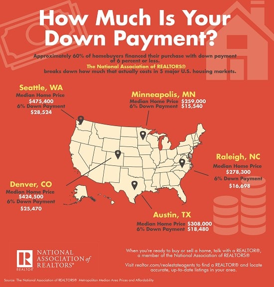 “How much money do I need to put down to buy a house?” is often one of the first questions of potential homebuyers. According to data compiled by the National Association of Realtors (NAR), approximately 60% of homebuyers purchased their homes with a down payments of 6% or less.