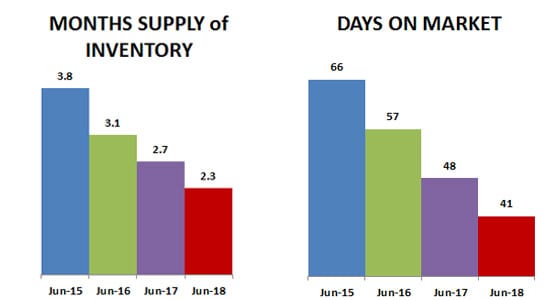 Average days on market before pending was 14.6% below last June and the shortest it has been all year, at 41 days. Although months supply of inventory was slightly higher than last month, at 2.3 months June 2018 was still 14.8% behind last June. The market is considered balance between buyer and seller when there is a 5-6 month supply of homes for sale. We are still in a strong seller’s market.