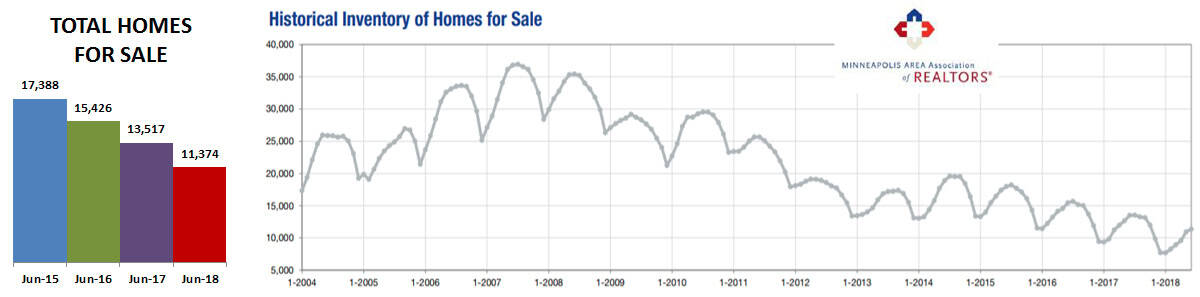 Overall inventory for June 2018 was down 15.9% compared to last June. As you can see by the humps in the chart below, it has been dropping steadily each year since 2014.