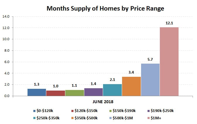 Townhomes have consistently been in shortest supply, with June 2018 months supply 20.0% below last year.