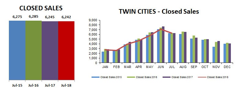 What struck me the most about the real estate stats for July 2018 was how, after peaking in June, closed sales have been almost identical for the past 4 years. Remember that closed sales typically lag 4-6 weeks after accepting an offer, so July closings mark the end of the spring season. August closed sales typically pop up again a bit, reflecting the typical uptick in activity following July 4th vacation time.