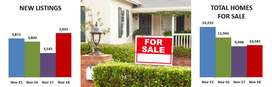 This is the shift we have been waiting for, but we still have a long way to go to get to a balanced market. The red line on the chart below shows a balanced market at 6 months supply of inventory. At 2.1 months for November, it was 10.5% over November 2017 but still low. The previous 3 months were holding steady with last year.