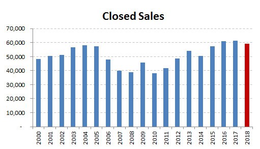 The first half of the year was marked by buyer frenzy, which slowed in the last part of the year resulting in a 3.4% decrease in annual closed sales. A shortage of homes for sale coupled with affordability at a 10-year low made it tough for buyers in 2018.