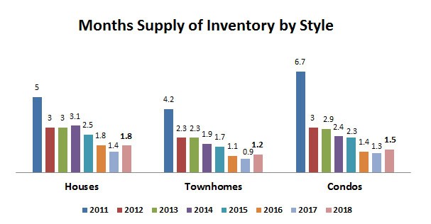 Supply also varies based on property style. Single family houses had the biggest supply at 1.8 months… condos next at 1.5 months… and townhomes with the shortest supply at only 1.2 months. It provides an interesting contrast to 2011, when the supply of condos was approaching seven months!