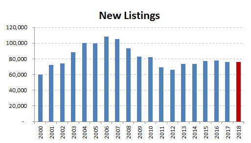 In spite of an increase in new listings in each of the last six months of 2018 the year closed out with the total new listings for the year just 190 below 2017. Expect new listings to show annual growth in 2019.