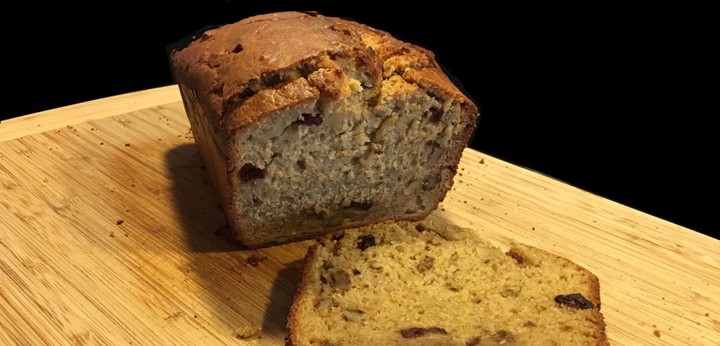 Pour into loaf pan and bake until a wooden pick or skewer insert in center of bread comes out clean, about 1 – 1 1/2 hours. Cool bread in pan for 3 minutes, then remove from pan and continue cooling on a rack to cool completely.
