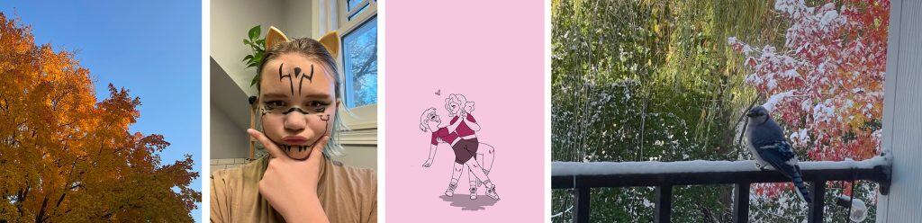 After beautiful crisp, colorful fall days we awoke to the first snow of the season on Halloween… frosting the colorful trees. I always find the first snow magical… our son said he played Christmas music. It was the second snowiest Halloween on record! A blue jay landed on our railing… and the snow was crunchy under foot. Our granddaughter shared her Halloween photo and her latest drawing.