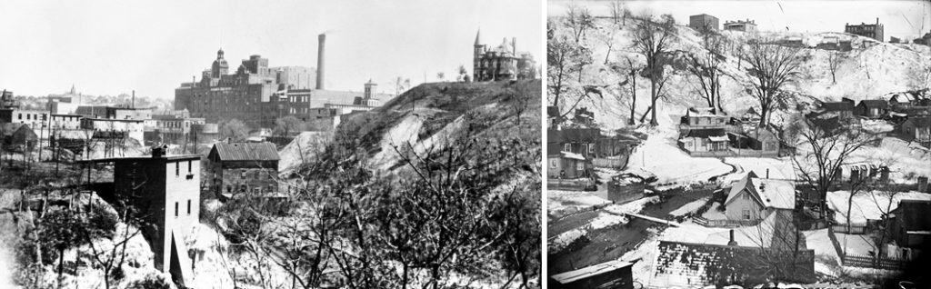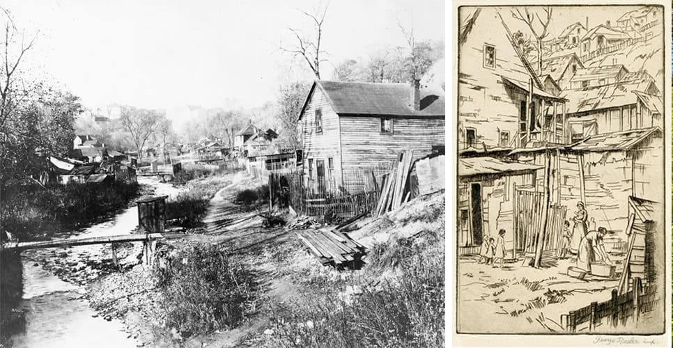 Initially used by Native American peoples, Swedish immigrants began settling in the hollow in about 1860 and according to reports there were around 110 families in the hollow in 1886… hence its name “Svenska Dalen” or Swede Hollow. Most of the simple homes were clustered along the creek, and none had city water or sewer. Abundant jobs were available nearby at breweries, mills and railyards.
