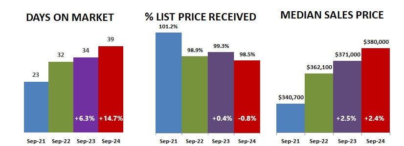 Days on market before pending is growing, but it is still lower than it was before the pandemic. Conversely, the percent of list price received is dropping but still fairly high at 98.5%… and median sales price continues to rise, as a result of continued competition due to low inventory.