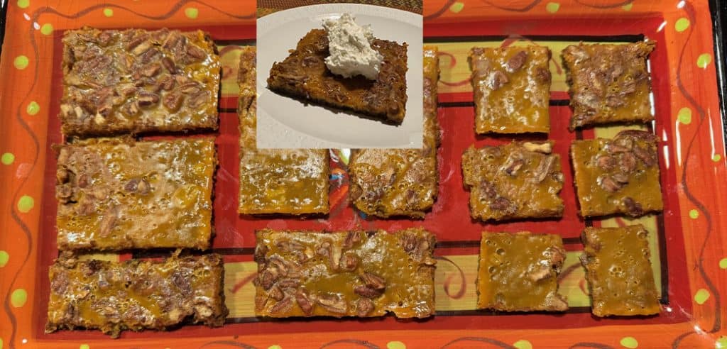 I found this week’s recipe in Lunds & Byerlys Real Food magazine and decided to try it this week. It didn’t turn out as I expected, but the flavor was good and I found myself craving it… our granddaughter said she really liked it, and our daughter-in law asked me for the recipe for the thin pumpkin bars this morning! So… I guess it was an unexpected hit. The recipe calls for a 12 x 17 inch sheet pan, which I thought seemed big for the amount of ingredients… but I dutifully followed the recipe. Part of the crust burned because it was so thin (would use shorter bake time next time)… and the pumpkin and pecan layer was also very thin. The description was accurate: “crunchy, sweet, spicy, and rectangular”… with a slab you can cut whatever size pieces you want. It was flat and floppy, but delicious! Based on the photo with the recipe, I would try the next size smaller sheet pan to make it more pie-like and more of the delicious crust… or double the ingredients for the big sheet pan… but there is also something intriguing and unique about the ‘thin pumpkin bars’!