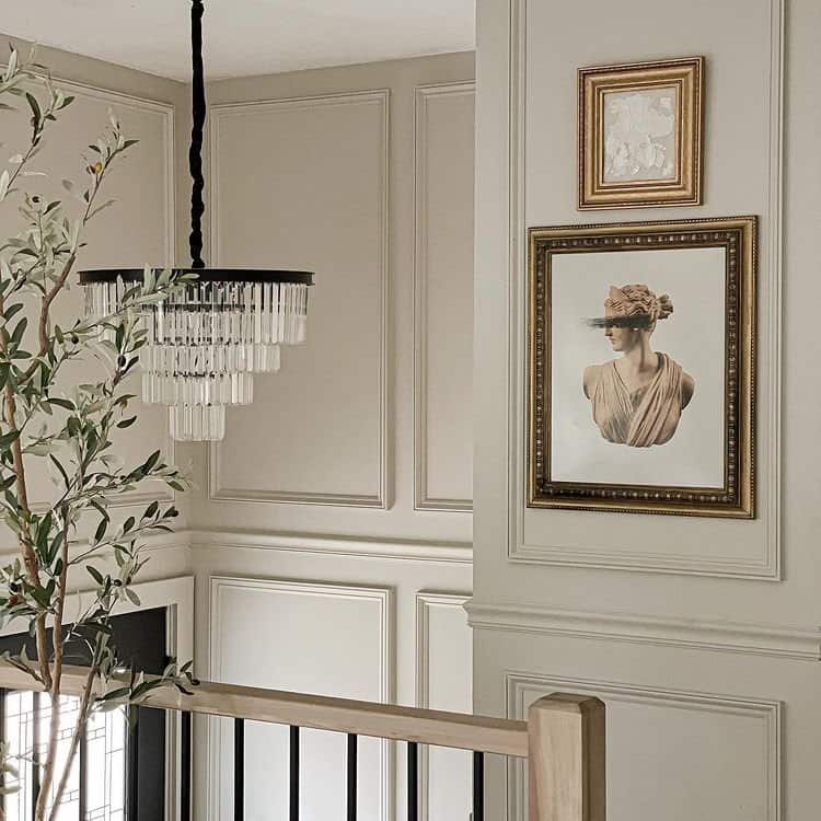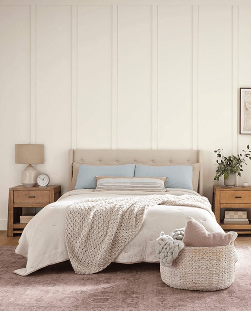 Not sure if you want tan, cream or beige? This paint may be the perfect color for you. Shoji White by Sherwin Williams is a warm paint color that is a beautiful blend of cream and beige. This color will really lean into it’s warm roots in a south or west-facing room. With an LRV of 74, its considered a light, almost off-white, color. Shoji White has become popular in recent years due to its natural, earthy hue.