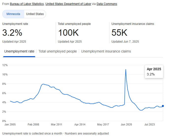 According to the US Bureau of Labor Statistics, the Minnesota unemployment rate in April 2025 was 3.2%, up from 3.0% in April 2024 and below the national average average of 4.2% in 2025.