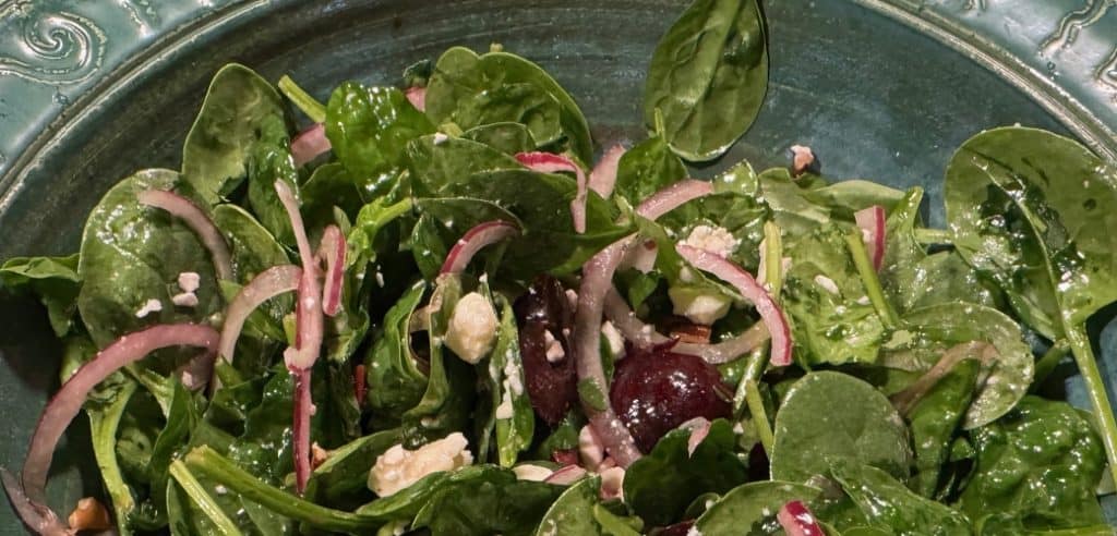 Pour the dressing over the spinach mixture and mix with two spoons until every leaf is coated with the dressing.