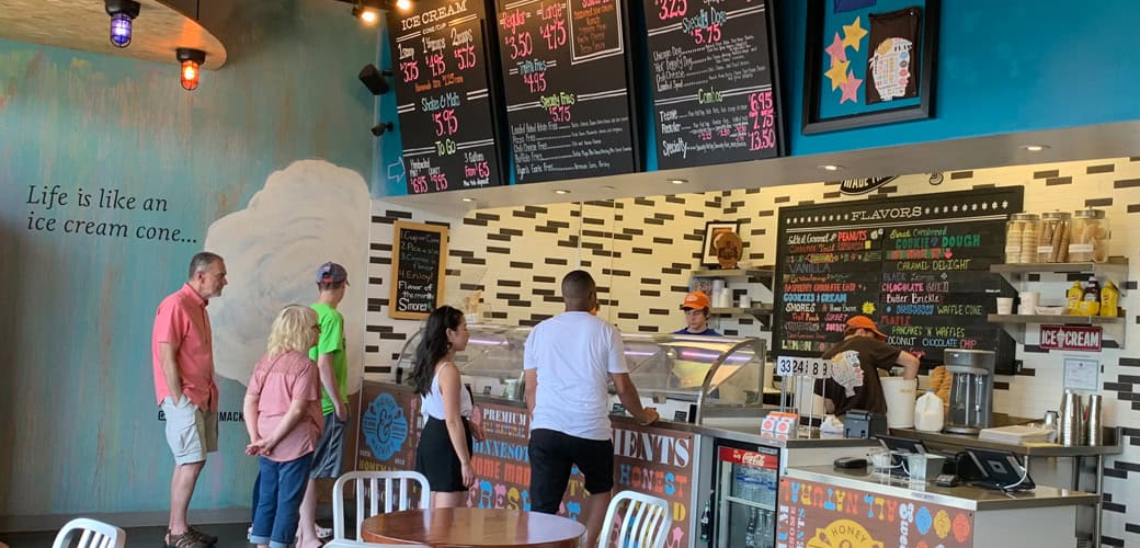 Honey & Mackie’s sign reads ice cream and fries. OK, I forgot about the fries! But the Frozen Hot Chocolate ice cream was terrific! We’d heard good reports about this...