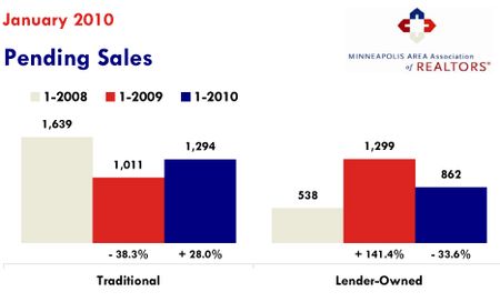 In 2009, lender-mediated sales accounted for 43.0% of all Minneapolis-St. Paul metro area home sales. The percent of foreclosures improved throughout the year, however, and January continued the trend. Traditional pending sales were 28.0% higher...