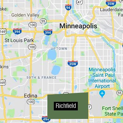 Located straight south of Minneapolis, Richfield is bordered by Edina’s Southdale area on the west and the MSP airport on the east. It began as a small farming community, became a village in 1908 and a city in 1950. Largely residential with many 1950s ramblers and 1 1/2 story homes, it also has a couple clusters of 55+ age condos. It park include the first municipal nature center in the metropolitan area. It is the headquarter for Best Buy corporation.